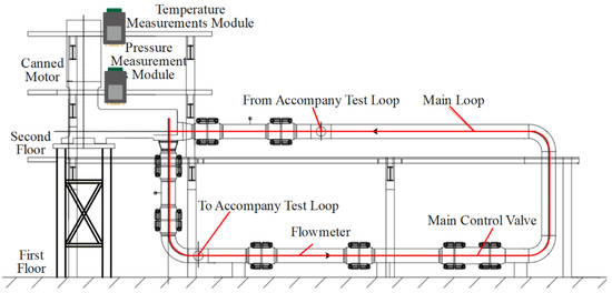 The test system scheme is shown in Figure 4. The main pump coolant circuit, flowmeters, and main control valve system were installed on the first floor, and the accompanying test loop was connected. The motors pressure and temperature measurements module system were installed on the second floor. They can also be seen in the pictures shown in Figure 3d.