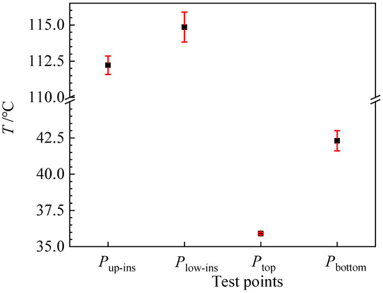 Before the test, all measuring instruments were calibrated and the PT100 platinum thermistor sensor four-wire was used. The error of the test instrument itself is very small. In addition to the inlet and outlet temperature of the secondary cooling water, there were many other test points and the accidental error was relatively small. The position of the sensor installation at the top and bottom of the primary cooling water measuring points is shown in Figure 3b,c. When the sensors were installed, it should ensure that they were closely attached to the ambient wall to avoid thermal contact resistance, which was convenient for heat conduction and reduces the response time of the temperature change.
