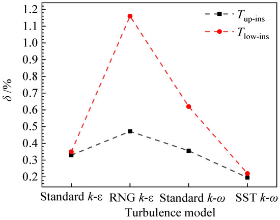 As mentioned above, the test temperature of the stator winding insulation could be taken as the peak temperature of the motor. Therefore, it was one of the key parameters for verifying the accuracy of the predictions. Figure 7 showed δ the relative error of the temperature of the stator winding insulation adopted by four types of turbulence models by CFD simulation.