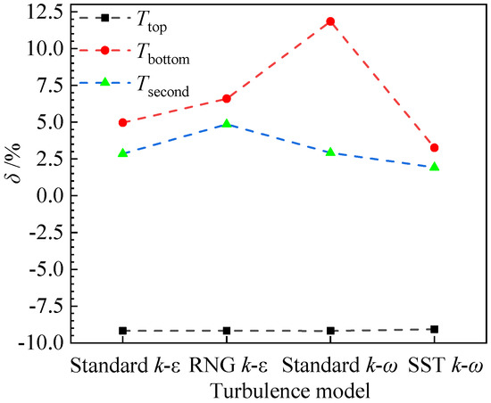 Furthermore, it can be seen from Figure 8 that the Tbottom calculated by four types of turbulence models was different, and the relative error was relatively larger than the Tsecond. The minimum relative error compared to the experimental results was observed in the SST k-ω model (3.26%) followed by the standard k-ε (4.96%) and RNG k-ε (6.59%) models, whereas the standard k-ω model provided the maximum relative error of 11.84%. This was due to the relatively strong sensitivity of the calculation results of the standard k-ω model, which depended on the k and ω values of the free flow inside and outside the shear layer, which must be corrected.