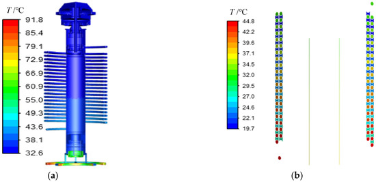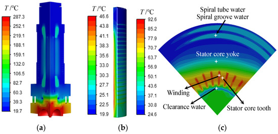 Figure 9b shows the temperature contour of the casing extract of Figure 9a. It can be seen from Figure 9b that the inner surface of the casing ambient the stator core was with high temperature, and the temperature gradually decreased along the radius direction with about 20 °C temperature drops. The accurate temperature distribution of the casing provided important basic data for thermal stress calculation.
