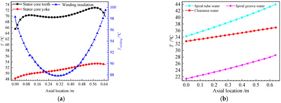 It can be seen from Figure 10a that the temperature curve of the stator winding was low in the middle and high at both ends, and the lower end was higher than the upper end. The distribution characteristics of the stator winding temperature were the same as those previously studied [10]. The temperature curve of the stator core yoke gradually increased along the axial position and basically changed linearly. Because of its small heat source density, the temperature was low. The temperature curve of the stator core tooth increased non-linearly along the axial direction. The temperature of the lower end of the stator core tooth was higher than that of the upper end and its heat flux density was higher, so the temperature was higher. In addition to the upper and lower end positions, the temperature of the core lamination was lower than that of the stator winding, which absorbed the heat from the stator winding. The axial thermal conductivity of the laminated core was relatively small, and the axial temperature difference was small. The accurate temperature distribution of the stator core could also provide important basic data for the thermal stress calculation of the motor.