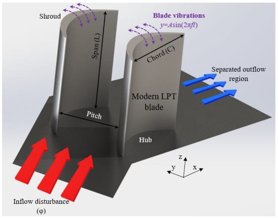 Low-Pressure Turbines (LPTs) are an important component of gas turbine engines used to power passenger aircraft. The engine thrust is mainly generated by a fan driven by an LPT, which weighs up to 30% of the overall engine weight [1]. LPTs are also an important part of the gas turbines used to run electric power generators. The efficiency and structural integrity of an LPT are effectively influenced by the aerodynamic and aeroelastic behavior of the turbine blades under the influence of flow disturbances [2]. Therefore, the realistic prediction of the aerodynamics and aeroelasticity of LPTs by using numerical methods has become popular among many researchers.