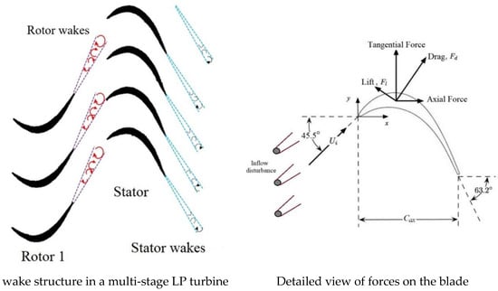 Schematic view of the wake generation in a multi-stage turbine and forces over LP turbine blade.
