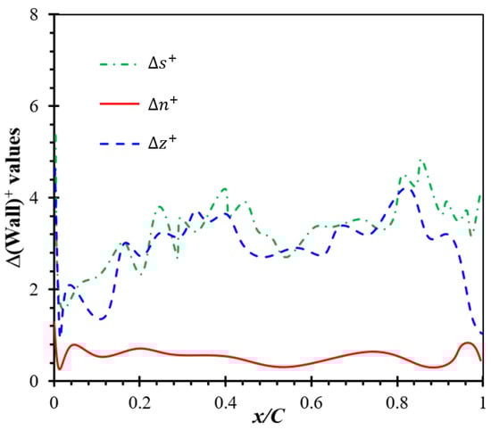 The boundary layer grid with 12 inflated layers is selected for the DNS study to resolve the viscous sub-layer effects and to accurately predict the causes of aeroelastic vibrations on the flow structure on the suction side of the blades. To make sure the wall+ parameters are in an appropriate range, the following condition should be met: [38]. During entire simulations, the normalised grid size in the streamwise , and spanwise direction are also kept less than 10 [38]. The wall+ values over the surface of the vibrating T106 blade with clean inflow (φ = 0) are shown in Figure 4. The wall+ values are all within acceptable ranges. Consequently, the prism mesh is accurate enough to capture the flow structure and flow separation in the boundary layer region of the oscillating T106 low-pressure turbine.