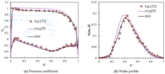 Prior to investigating the impact of the inflow disturbances on the unsteady flow behavior, the DNS simulation based on a stationary blade without any inflow wakes is first made for validation of the numerical model. The wake deficit profile Ω is specified as (pt-in − pt)/(pt-in − prf), in which pt is the total pressure and prf, and pt-in are the reference pressure and the total inlet pressure, respectively. The wake deficit is obtained at 40% of the chord length downstream of the trailing edge of the blade. Ω predicted by the present DNS simulation is compared to those of the experiment [39] and the reference simulation using an unsteady finite volume method [12], and they are presented in Figure 5. Overall, a close agreement is achieved between the present DNS simulation and the experimental data. Likewise, the pressure coefficient Cp from the present simulation is compared to the experiment and the reference simulation using a finite volume method [12], as shown in Figure 5. Cp is calculated as (pw – prf)/(pt-in – prf), where pw is the surface pressure. It is seen that the Cp distribution predicted by the present simulation is in very good agreement with the experiment and the reference simulation. The obtained results are also in good agreement with the numerical results of Nakhchi et al. [40] over stationary low-pressure turbine blades with clean inflow conditions. Therefore, it is deduced that the method reasonably resolves the unsteady flow and the downstream wake, which is considered sufficient for further simulations involving inflow disturbances and blade vibrations.