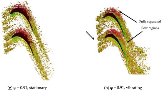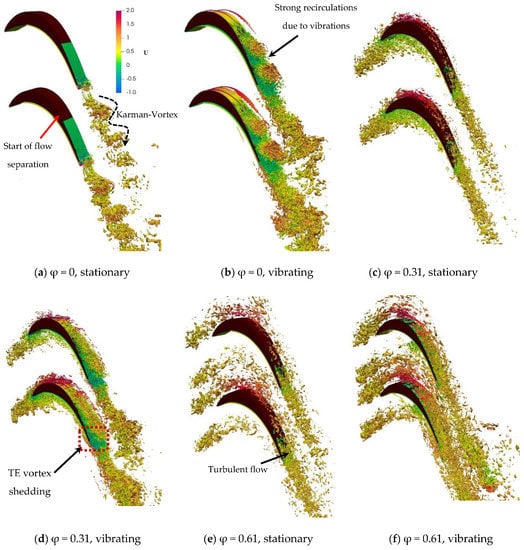 Figure 6 compares the iso-surfaces of vorticity (coloured by velocity) between the stationary and vibrating blade cases with and without inflow wakes to qualitatively highlight the flow structures that occurred due to blade vibration. The inflow wakes at different frequencies, which are achieved by placing a different number of cylinders in the upstream region of the blade. The cases using a stationary blade will be first discussed. When there is no inflow wake present at the inlet, the flow separation occurs near the trailing edge due to the curvature of the blade and the angle of attack of the incoming flow. When there is an inflow wake upstream of the blade, the flow across the blade is extremely distorted. At φ = 0.31, the vortex structures from the wake mostly influence the pressure surface of the blade before contributing to the downstream wake. At φ = 0.61, the suction surface of the blade is more affected by the wake structures, whereas the flow structures travel underneath the pressure surface and hit the trailing edge of the blade, where they combine with those from the pressure surface. However, at φ = 0.91, the T106 blade is influenced by the inflow wake. As a result, the downstream wake is stronger than that of those with a stationary blade. The blade vibration triggers more flow disturbances. It can be clearly observed in the case of a clean inflow without wakes. It is seen that strong vortex structures are generated on the suction side due to the blade motion. These flow structures travel downward and contribute to the vortex shedding, resulting in a larger downstream wake. A combination of inflow wake and blade vibration causes significant flow distortions around the blade, and both pressure and suction surfaces are affected. This leads to high-intensity turbulence and wake in the downstream region. It is very clear in the case of φ = 0.91 that the downstream wake is not only highly unsteady and turbulent but also dramatically large in size.