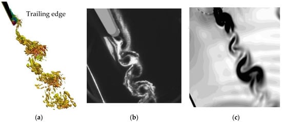The vortex development near the trailing edge resolved by the present DNS model and those of the experiment [41] and the previous LES model [26] for a stationary blade subject to no inflow wakes are compared in Figure 7. It is seen that the LES model can reasonably provide the vortex shedding from the trailing edge. However, the method can detect the vorticity production in more detail, and it is comparable to the experiment. In particular, the DNS model resolves and provides detailed vortex structures in the downstream wake region, which are difficult to capture by lower-fidelity models as well as the experiment. Therefore, the use of a DNS model should be considered in the design of low-pressure turbine blades, and the present DNS model is found to be much more efficient at a reasonable computational cost than other typical finite volume DNS models.