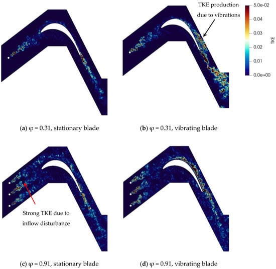 To better understand the physical behavior of the turbulent flow subject to incoming wakes and blade vibration, the turbulent kinetic energy contours around the T106A turbine blade are plotted at φ = 0.31 and 0.91 for both stationary and vibrating blades in Figure 8. At φ = 0.31, the turbulent flow resulting from the inflow wake decay and the flow distortion occurs in the blade passage. Apart from the area close to the cylinder where the wake is generated, the maximum turbulent kinetic energy is seen in the downstream wake region. In the case of the stationary blade, the maximum value was captured in the region next to the trailing edge. In contrast, it is evident that the blade vibration adds more turbulence to the flow. Subject to the same inflow wake condition, the kinetic energy flow is much higher on the suction surface. Increasing the inflow wake frequency to φ = 0.91, the turbulent flow is observed around the stationary blade. Similar to the φ = 0.31 case, the turbulent kinetic energy distribution is intensified by the blade vibration. In particular, the maximum values of the turbulent kinetic energy are observed almost all over the suction surface, in addition to the downstream wake region.