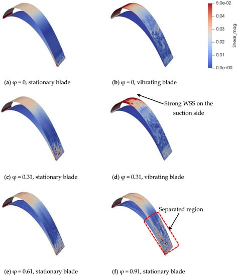 Figure 9 illustrates the wall shear stress distribution for different inflow frequencies. It is found that the blade oscillations have a noticeable influence on the wall shear stress distribution in both clean inflow and inflow wake cases. Compared to the clean inflow case, the inflow wake also has an effect on the wall shear stress, especially near the trailing edge. Besides, the region in close proximity to the leading edge is also affected by the wake at a high frequency. The wall shear stress, depending on its level of intensity, is directly associated with the flow separation and recirculation on the suction side.
