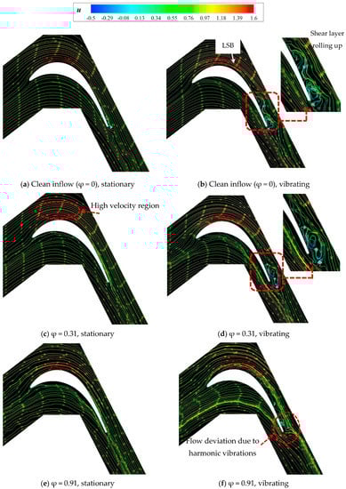 The flow streamlines in the blade passage of the T106A turbine are demonstrated in Figure 10. The figure provides the effect of the inflow wake and the blade vibrations on the behavior of the flow. For clean inflow, it is clear, without the effect of the distortion due to the wake, that the flow is affected by the vibrations. The oscillations cause flow separation on the suction surface with some recirculation in the separation zone. Inflow wakes add further flow disturbances. The streamlines traveling over the pressure surface are more affected by the wake.