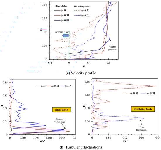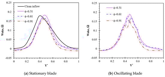 It was previously discussed that the downstream vortex shedding is stronger with more vorticity structures in the wake. Moreover, the maximum wake loss value is reduced by 16.4% by increasing the inflow wake (φ) from 0.31 to 0.91. It was also noticeable that the vortex structures are broken into smaller pieces in the wake region due to inflow wakes. These factors contribute to the shift in the peak of the wake profile. Furthermore, it is obvious that the blade oscillations have a great impact on the wake profile. Similar to the rigid (non-oscillating) blade, the profile is reduced as the inflow wake frequency is increased. The peaks of the profiles are also found at Y* = 0.501. Significant deviations in the profile can be seen between 0.3 < Y* < 0.6. The blade vibration triggers additional flow disturbances, which add more turbulence to the downstream wake. In addition, the downstream wake is distorted by the blade motion. As a result, the profile is highly affected, and fluctuations are observed in the profiles.