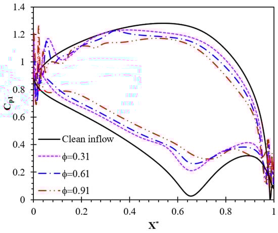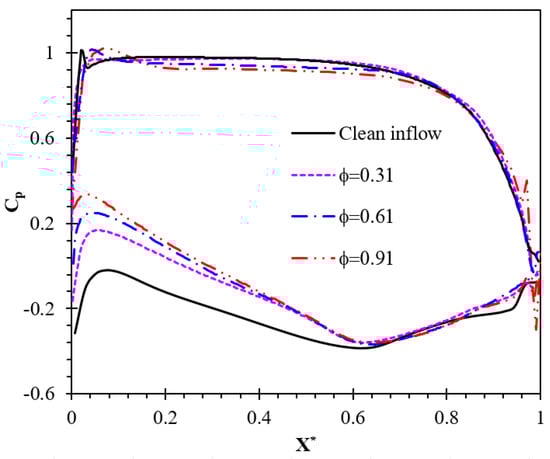 The effect of inflow wakes on the downstream wake profile of the stationary blade case is presented in Figure 11. The wake loss is defined as (pt-in − pt)/(pt-in − pref), where pt is the total pressure, and measured at 40% of the chord length in the downside region. The dimensionless pitch is defined as Y/Pitch. It is observed that the profile is slightly reduced by increasing the inflow disturbance from to 0.91. By raising the inflow disturbance, the separated bubbles tend to shrink, which has a noticeable influence on the pressure value in the downstream region. The inflow disturbance reduces the boundary-layer separation region. It is observed that the maximum value occurs at Y* = 0.401, and it moves downward to Y* = 0.492 by raising φ from 0 to 0.91.