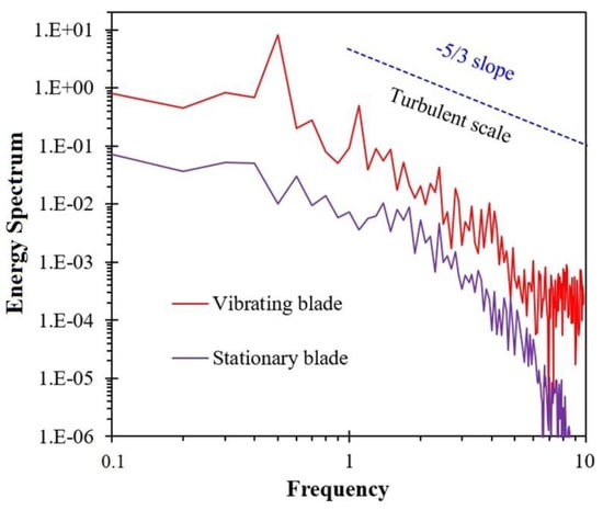 Illustration of the turbulence energy spectrum with and without the blade vibration at Re = 5.18 × 104 and φ = 0, at X/C = 0.7.