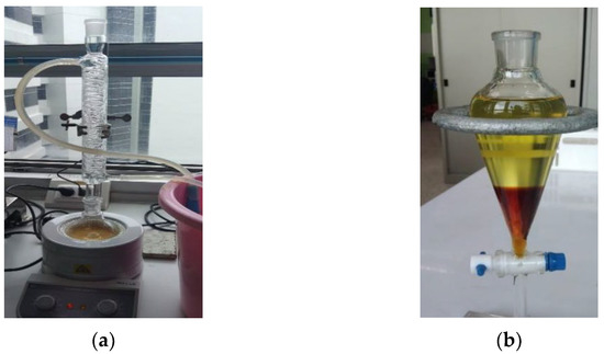 Photographic view of the (a) biodiesel setup and (b) purified biodiesel in the top layer.