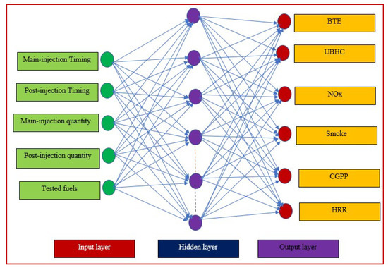 The Bayesian neural network strategy is a sophisticated approach that serves as an effective means for improving the generalization capabilities of neural networks. This technique incorporates the Bayesian framework, which introduces modifications to the performance function that deviate from the conventional sum of squares of the network errors on the training set. The network weights and biases are considered random variables within this framework, with predetermined distributions. The unknown variance that is associated with these distributions is linked to regularization parameters, thereby improving the performance and precision of the network [16]. Statistical methods can be used to estimate these parameters. The mean sum of squared network errors serves as the objective function in the BRNN. A linear combination of weights and squared errors is minimized by BRNN [19]. Additionally, it changes the linear combination so that the final network has high generalization capacities. Training is terminated when any of the following conditions are met: the maximum number of epochs is reached, the maximum time limit is exceeded, or the performance has reached its goal. Additionally, training is halted if the performance gradient falls below the minimum gradient or if the learning momentum exceeds the specified maximum range. In MATLAB, any type of network, including artificial neural networks (ANN), can be trained using the “trainbr” command, provided that the network’s weight, net input, and transfer functions contain derivative functions [20,21]. Hence, in this present work, BRNN associated with the logistic–sigmoid transfer function was used to predict the engine characteristics; the input variables for ANN modeling were main injection timing (X1, 17–25 °C), post-injection timing (X2, 7 °C bTDC- 7 °C aTDC), main injection quantity (X3, 70–90%), and post-injection fuel quantity (X4, 10–30%). Fuel proportion (X5, diesel and biodiesel) and BTE, CO, UBHC, NO, smoke, CGPP, and HRR were output responses. The architecture of the artificial neural network (ANN) model for the diesel engine characteristics is illustrated in Figure 2.