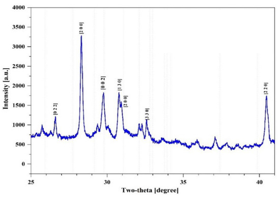 An Ultima III diffractometer was used to record the bio-catalyst’s X-ray diffraction pattern (Rigaku, Tokyo, Japan). The bio-catalyst’s wide-angle X-ray diffraction pattern is displayed in Figure 4. The (0 0 3) plane is the distinctive graphitic structural peak found at 21.19°. The K2CO3, KCl, and K2SO4 reflections are the main visible in the prepared bio-catalyst. The face-centered crystal structure of K2CO3 has peaks at 25.7°, 29.6°, 32.1°, 32.3°, and 32.6°, which correspond to the (0 0 4), (0 4 1), and (3 3 0) planes. The detection of peaks at 29.9° and 30.4° corresponding to the (1 3 0) and (2 2 0) planes, respectively, allowed for the identification of the face-centered crystal structure of K2SO4, A second peak at 28.28° reveals the KCl reflection plane (2 2 0). The Debye–Scherrer formula was used to determine the average catalyst’s crystalline size, which was found to be 56.66 nm.