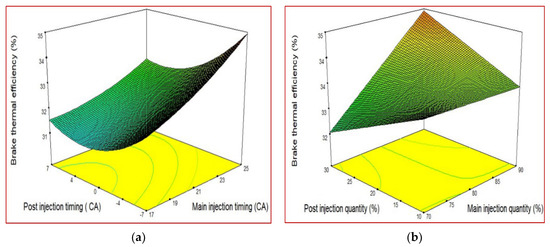 Variation in (a) brake thermal efficiency with respect to main injection and post-injection timing, and (b) main- and post-injection fuel quantity.