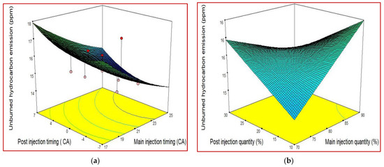 Comparison of unburned hydrocarbon emission of (a) main injection and post-injection timing, and (b) main- and post-injection fuel quantity.