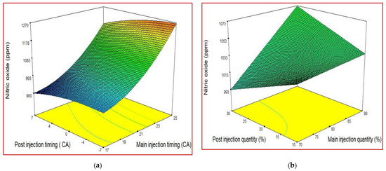 Nitric oxide emission from biodiesel fuel engine under effects of (a) post-injection timing vs. main injection timing and (b) post-injection quantity vs. main injection quantity.