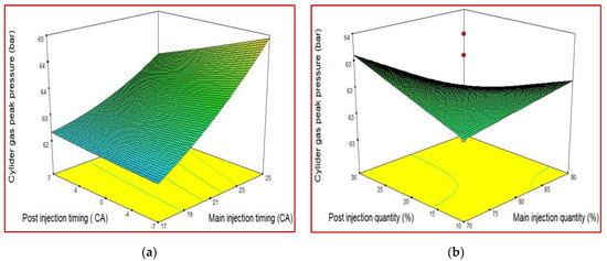 Effect on in-cylinder peak pressure of diesel engine characteristics under different (a) post-injection timing vs. main injection timing and (b) post-injection quantity vs. main injection quantity.