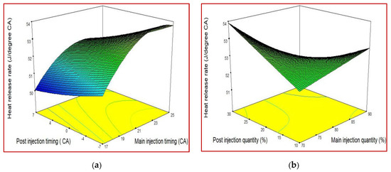 Influence of (a) post-injection timing vs. main injection timing and (b) post-injection quantity vs. main injection quantity on heat release rate of diesel engine emission during fuel testing.