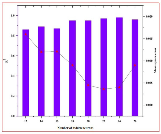 Selection of neurons for ANN modeling based on MSE (Red triangle) and R2 values.