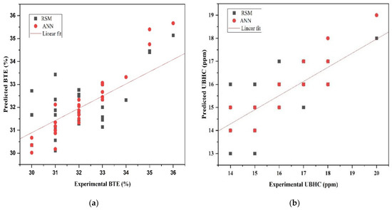 A comparison between UBHC emissions of biodiesel under different fuel injection quantities and injection timings is depicted in Figure 7a,b. As depicted in Figure 7a, an increase in the percentage of main injection fuel quantity from 70% to 90% results in a corresponding increase in UBHC emissions. However, Figure 7b shows that as the injection timing is advanced from 17 to 25 °C and 7 °C bTDC to 7 °C bTDC, UBHC emissions decrease. The existence of UBHC in the exhaust gas indicates the incomplete combustion of fuel. B100-80%-20% emits the least UBHC, 14 ppm, when compared to other combinations such as B100-70%-30% and B100-90%-10% and conventional diesel. The results suggest that advancing the injection timing leads to lower UBHC emissions, regardless of the injection quantity. It progresses the spray characteristics, which aid in complete combustion [26]. Further, RSM determined the maximum UBHC, 17 ppm, for B100-90%-10% at 17 °C, which is comparable to the experimental results and demonstrates zero error in the RSM prediction and ANN method. Around 26% UBHC emission reduction was observed when 80%-20% of fuel was injected as main and post-injection fuel at MIT of 25 °C and PIT of 7 bTDC at an injection pressure of 500 bar. This can be attributed to the fact that early injection and higher injection pressure create smaller fuel droplets, which enhance the fuel–air mixing process and reduces the formation of fuel-rich regions, resulting in lower UBHC emissions [26]. Additionally, the occurrence of oxygen in biodiesel stimulates the oxidation of UBHC and minimizes the formation of UBHC emissions.