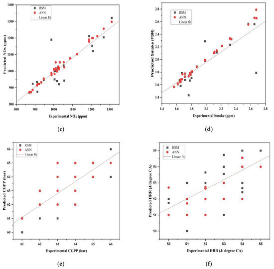 Comparison of experimental results with predicted ANN and RSM results: (a) BTE, (b) UBHC, (c) NO, (d) smoke emission, (e) CGPP, and (f) HRR. Black dot and red dot/red square represent the predicted RSM and ANN values, respectively.