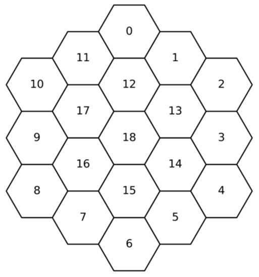 In the OpenMOC-HEX code, the process numbering of the hexagonal assemblies starts from the top hexagonal assembly along a clockwise direction and increases from the outermost ring to the innermost ring. For example, in a three-ring hexagonal core, the MPI process numbering of each assembly is shown in Figure 3.