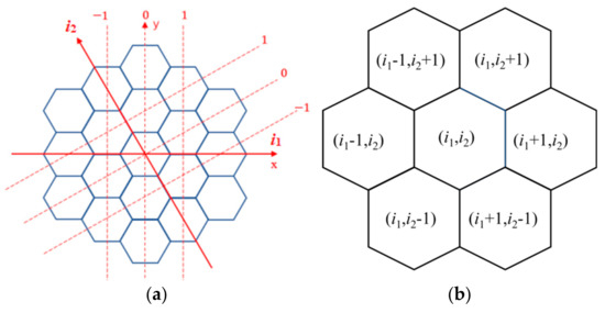 According to the coordinate , the coordinate points may be located in , , , or . It is necessary to further determine which of the above four grid elements the point is indeed located in. The method is to calculate the distance between the coordinate point and the center point of the four hexagonal grids, and the grid element with the shortest distance is where the coordinate point is located.