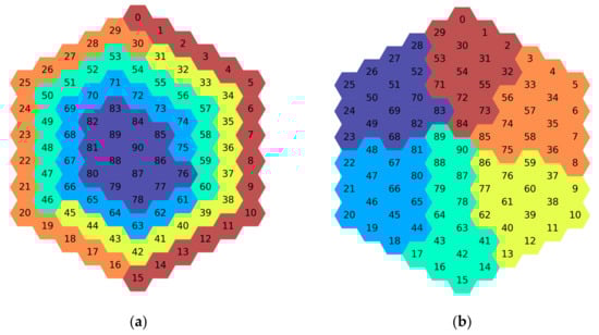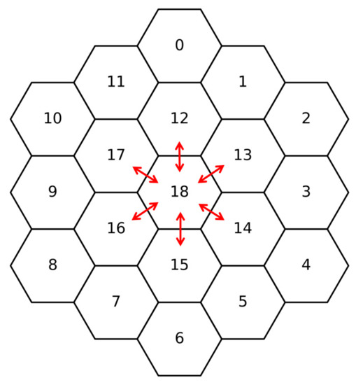 It can be seen from Figure 3 that the adjacent edge correspondence of the hexagonal core depends on the number of rings. In order to find out the process number of the hexagonal assembly corresponding to the adjacent side, this study uses the method of transforming the coordinate system and regards the entire core composed of the hexagonal assemblies as a hexagonal grid. Firstly, the coordinates corresponding to the process number mentioned in Section 2.1 is calculated. Secondly, the hexagonal coordinates of the neighbors of the corresponding edges are obtained as shown in Figure 4. Finally, the process numbers of the neighboring assemblies are calculated based on the coordinates of the neighboring assembly.