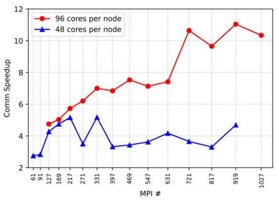 Combining the additional data exchange information and the communication time acceleration ratio shown in Table 4 and Figure 8, it can be observed that in Platform 2 (48 cores per node), there are significantly more communication data between nodes and a similar reduction in communication volume. However, the communication time acceleration effect is significantly lower than in Platform 1 (96 cores per node). We speculate that this is because the InfiniBand technology used in supercomputers achieves high bandwidth and low latency. Hence, its communication time growth is lower than the growth of data volume, which is beneficial for large-scale computing in computer clusters. The lower communication optimization on Platform 2 is due to its older hardware configuration and higher latency.