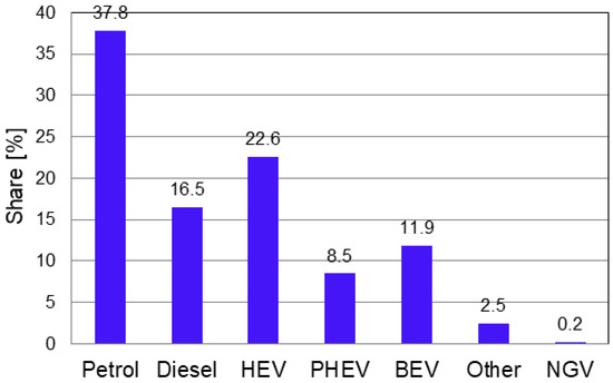 - New Car Registrations by Fuel Type, European Union. Available online: www.acea.auto/fuel-pc/fuel-types-of-new-cars-battery-electric-11-9-hybrid-22-6-and-petrol-37-8-market-share-in-q3-2022/ (accessed on 14 January 2023).