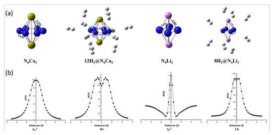 The moiety N6 had the attention of the scientific community not only for possible use as high energy density material, but also for the structural pattern [93,94,95,96,97]. In 2011, Chattaraj and co-workers reported the aromaticity of N64− and N42− planar cyclic rings. Moreover, they studied these anionic systems with suitable co-ion in the search of a good hydrogen storage material and modelled the N4Li2 and N6Ca2 clusters [18]. A detailed investigation was conducted on the aromaticity of these systems. NICS(0) calculations revealed that both the anionic systems, N64− and N42−, possess aromatic criteria to compare with benzene and cyclobutadiene, respectively. They performed a NICS scan plot for N64−, N42−, benzene, and cyclobutadiene, and detected similar patterns for N64− and benzene. On the other hand, a different nature of plots was obtained for N42− and cyclobutadiene rings. There are ten π-electrons in the N64− cyclic planar system, which were noted to be aromatic. In contrast, surprisingly, the N42− monocyclic system revealed simultaneous appearance of π-aromaticity as well as σ-antiaromaticity, which was then called conflicting aromaticity. They concluded such σ-antiaromaticity due to the obtained positive value of NICS(0) whereas the π-aromaticity was projected from the (−)Ve magnitude of NICS(1). It is possible that the cation–π interaction between Ca2+ ions and N64− rings as well as between Li+ ions and N42− rings stabilized the N6Ca2 and N4Li2 systems, respectively. Such composite systems can interact with up to twelve hydrogen molecules. Local minima forms of hydrogen molecule-bound N6Ca2 and N4Li2 clusters are collected in Figure 2a. The researchers noted that due to the interaction of Ca2+ with the N64− ion, the aromaticity of the latter increases. On the other hand, the N42− monocyclic anion continues to show conflicting aromaticity even after the ionic contact with two Li+. It was mentioned that the binding of hydrogen molecules occurred due to the partial positive charges on the metal center. They noted favorable adsorption energy (ΔEads) for the interaction of hydrogen molecules. The following are adsorption energy data: 1.2 kcal/mol for the interaction with eight hydrogen molecules, with 4 H2 on each Li centers for N4Li2, and 1.3 kcal/mol for the interaction with six hydrogen molecules where each Ca binds 6 H2 in N6Ca2.