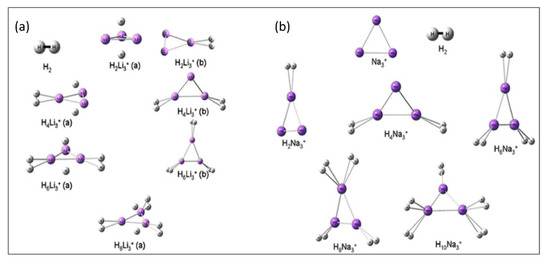 (a) Forms of H2-bound Li3+ and (b) H2-bound Na3+. This figure is reproduced from Reference [17].