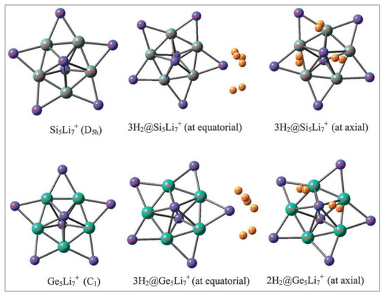 Local minima geometries of M5Li7+ (M = Si, Ge) and their H2 trapped analogues at the M06/6-311+G(d,p) level. This figure is reproduced from the reference [19].