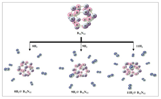 Energy minima forms (B3LYP/6-311+G(d)) of B12N12 and selected hydrogen molecule-bound analogues. This figure is reproduced from Reference [20].