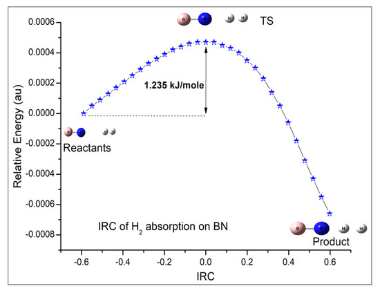 Relative energy profile for molecular hydrogen absorption on a single BN molecule. This figure is reproduced from Reference [20].