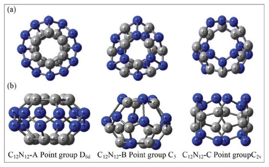 Local minima form of C12N12-A, C12N12-B and C12N12-C. In (a) panel, the top view is provided, whereas in panel (b), the side view is shown. This figure is reproduced from Reference [21].