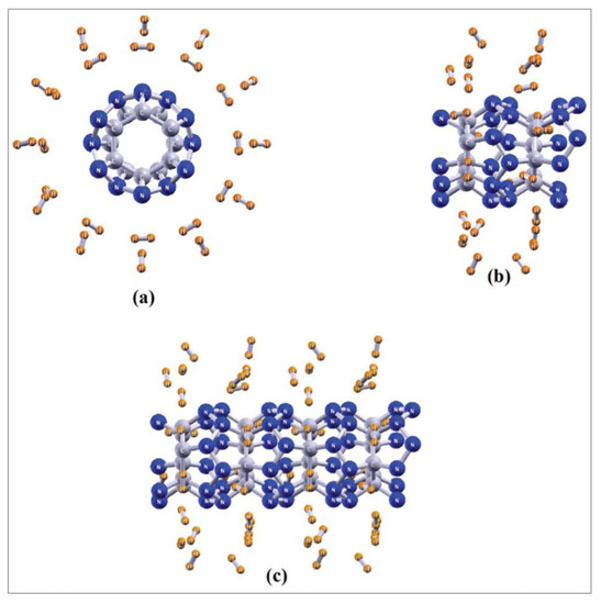 The segment (a) indicates the top view and the (b) marks the side view. The (c) represents a super cell form of the C12N24(H2)24 unit cell. This figure is reproduced from Reference [21].