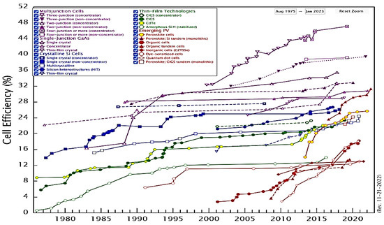 Classification of photovoltaic. The 2nd G, with an efficiency of 21.4%, came into existence after 20 years of research and development [9]. The disadvantage of 2nd G is that most of the components of these cells are becoming increasingly rare and expensive (indium), and some are toxic (cadmium). The 3rd G is a recent generation that has emerged due to the high costs of 1st G solar cells, materials availability limitations, and the toxicity of 2nd G solar cells. In addition to silicon, researchers use various new materials to make solar cells, such as nano-materials, silicon wires, solar inks created with conventional printing press technology, conductive plastics, and organic dyes- [9,18]. In [18], the fourth generation (4th G) classifies the new generation of solar cell technology. It uses a combination of organic and inorganic materials for manufacturing. The advantage of 4th G is combining inorganic and organic materials to maintain cost and increase solar to electrical energy conversion efficiency. The maximum efficiency of laboratory-based photovoltaic cells is more than 40%, according to the National Renewable Energy Laboratory (NREL) in 2020 [6]. According to NREL, Figure 2 shows the efficiency improvement trends as of November 2021.