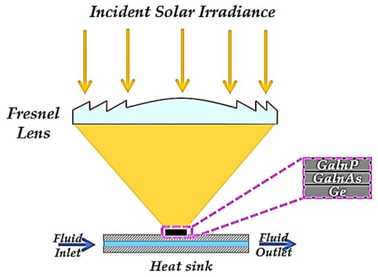 Concentrated photovoltaic (CPV) technologies are new advanced PV systems. The principle of operation includes focusing the sun into a solar cell using reflectors such as mirrors or an optical prism [19,20,21]. Beams of sun radiation hit a reflector and concentrate the rays of the beam onto a solar cell (Figure 3). A reflector is mostly a mirror or a lens that receives the primary solar radiation from the sun and focuses secondary solar radiation onto a cell located at the reflector’s focal point. CPV systems must track the sun to maintain the radiation’s concentration on the solar panel [22]. With 1000 suns of solar concentration ratio, researchers projected that the temperature of an uncooled solar cell would rise by 1360 °C [19]. Concentrated multijunction solar cells are essential in realising a more efficient photovoltaic. The incident solar energy on the solar cell’s surface is converted to generate electricity. In contrast, the rest is thermally absorbed within the solar cell. Consequently, this increases solar cell temperature [23]. On a long-term basis, increasing panel temperature leads to decreased conversion efficiency and lower panel reliability. Numerous cooling systems are developed and studied to prevent excessive temperature increases and improve their efficiency effectively [7]. As such, the cooling of CPV is still a challenge to researchers.
