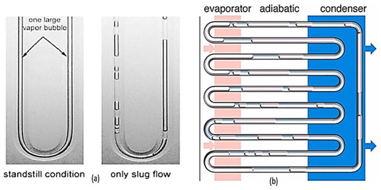 Looped pulsating heat pipe (a) Glass showing fluid and air [78] (b) Process diagram adapted from [76].
