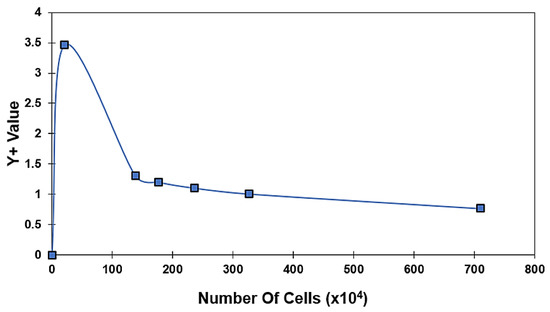 A mesh sensitivity analysis was conducted by increasing the number of cells until the y+ value was less than zero, as shown in Figure 7. The mesh used for the analysis consisted of 7,102,996 cells and 1,416,393 nodes with a Y+ value of 0.765. A user-defined function (UDF) was created for a flow rate ranging from 0.5 L/m (0.0085 kg/s) to 2.5 L/m (0.0425 kg/s) to generate pulsating flow at the inlet. The equivalent flow rate velocity (ranging from 0.5 L/m to 2.5 L/m) was used in the UDF, which was then imported into the FLUENT software. Subsequently, boundary conditions were defined at the walls, inlet, and outlet. The experimental process flow adopted is illustrated in Figure 8. Finally, a high-flux sun simulator experiment was conducted to validate the model.