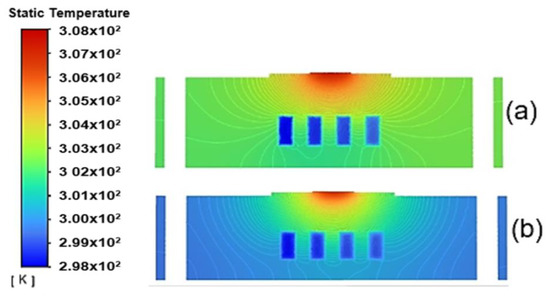 Figure 11 shows the model’s 2 D x-y centre-cut view temperature contour for continuous and pulsating flow at 1 L/m, with a maximum and minimum temperature interval of 298 K to 308 K. The pulsating flow, with a period of 2 s and a frequency of 0.5 Hz, equivalent to 30 pulses/minute (Figure 10b), shows better cooling compared to continuous flow (Figure 10a).