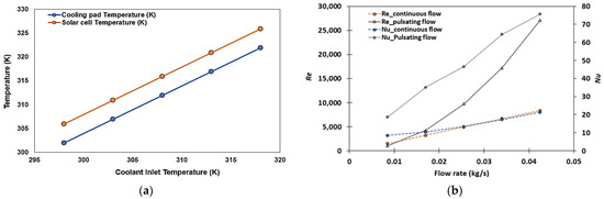 Figure 14a shows the effect of coolant inlet temperature on the model. With an increase in the inlet temperature of the coolant from 298 K to 318 K, the solar cell and cooling pad temperature increased from 301.92898 K to 321.90656 K and 305.88118 K to 325.86523 K, respectively. In Figure 14b, the effect of the flow rate on the Reynolds number (Re) and the Nusselt number (Nu). An increase in flow rate increases the Re number. With an increase in flow rate from 0.5 L/m to 2.5 L/m, the Re with continuous flow increased from 1482.41 to 8372.26. While with the pulsating flow at 30 pulses/minutes, the Re increased from 1047.33 to 27,108.48. The Nusselt number increases with the Reynolds number in continuous and pulsating flow, which agrees with [13].