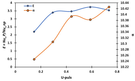Figure 15 illustrates the relationship between the Womersley number (α), the heat transfer rate, and the instantaneous velocity (U-p). The Womersley number indicates whether the uneven fluid flow in pulsing flow is almost constant. The Womersley number increases from 10.247 to 10.426 when the instantaneous velocity (U-p) increases from 0.14 to 0.73 m per second. The Womersley indicates that the pulsating flow is associated with the plug-like flow. Thus, the velocity profile is less than the pulse frequency. The enhancement in heat transmission increased from 2.196 to 3.539. Despite the increase in flow rate from 0.5 L/m to 2.5 L/m (Figure 15), at a speed of 0.587 m/s, the most significant improvement was seen. Hence, the pulsing flow made the cooling more effective and improved it by 37.95%.