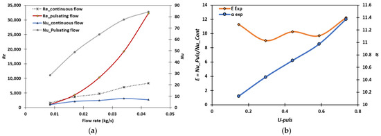 Figure 16a demonstrates the effect of flow rate on the Reynolds number (Re) and Nusselt number (Nu). With an increase in flow rate from 0.5 L/m to 2.5 L/m, the Re with continuous flow increased from 1617.55 to 8341.65. With pulsating flow at 30 pulses/minutes, Re increased from 1025.24 to 32,251.15. The Nusselt number increases with the Reynolds number in continuous and pulsating flows, consistent with [88]. In Figure 16b, the relationship between the Womersley number (α) and the rate of heat transfer and instantaneous velocity (U-p) is illustrated. The Womersley number indicates whether the uneven fluid flow in pulsating flow is nearly constant. When the instantaneous velocity (U-p) increases from 0.14 m/s to 0.73 m/s, the Womersley number increase from 10.13 to 11.37. This Womersley number means that pulsating flow is associated with plug-like flow at the maximum, resulting in a velocity profile lower than the pulse frequency. The enhancement in heat transmission fluctuates with maximum and minimum values of 12.21 and 9.02, respectively. At a speed of 0.73 m/s, the most significant improvement was observed.