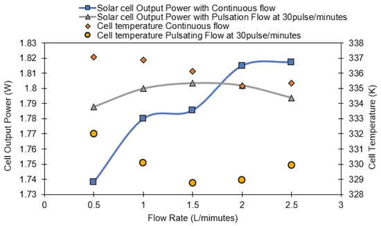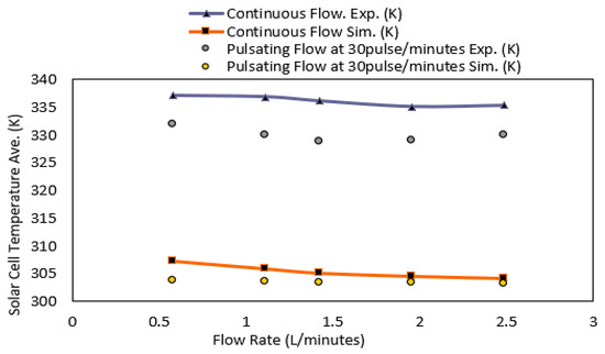 Figure 17 shows the solar cell temperature against the flow rate for simulation and experiment. The cell temperature decreased with an increased flow rate in both the simulation and experiment. Several researchers have reported that an increased flow rate decreases cell temperature [68]. Similarly, in this research, the cell temperature drops from 307.25 K to 304.25 K with continuous flow when the flow rate increases from 0.5 L/m to 2.5 L/m. At the same time, with the pulsating flow at 30 pulses/minute, the cell temperature drops from 303.75 K to 303.2 K. This shows that the cell temperature is lower with the pulsating flow than with the continuous flow temperature. The temperature difference occurs because the simulation was conducted based on the assumption that the flow does not involve radiation heat transfer (ambient temperature). In reality, the temperature of the solar cell depends on factors such as ambient temperature. This factor could only be controlled to a certain extent in the experiment.